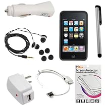 GTMax Black Soft Rubber Silicone Skin Cover Case + Rapid Car Charger + Home Charger + USB Data Cable + 3.5mm Stereo Headset + Full Front LCD Screen Protector + Stylus Silver for Apple iPod Touch 8GB 32GB 64GB 3rd 3G Generation NEWEST MODEL